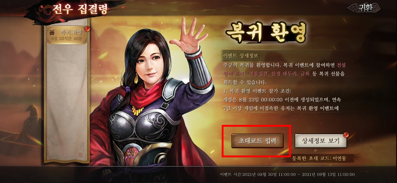 3. 아래와 같이 정상적으로 코드가 연동되었으면 이벤트 기간 내(9월 13일까지) 출석 일수 3일이상 및 Lv.5 토지 1곳 공략하기